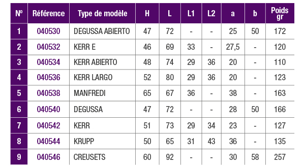 | Produit | 1 – DEGUSSA OUVRIR, 1 – DEGUSSA OUVRIR (10 U.), 2 – KERR E, 2 – KERR E (10 U.), 3 – KERR OUVRIR, 3 – KERR OUVRIR (10 U.), 4 – KERR LONG, 4 – KERR LONG (10 U.), 5 – MANFREDI, 5 – MANFREDI (10 U.), 6 – DEGUSSA, 6 – DEGUSSA (10 U.), 7 – KERR, 7 – KERR (10 U.), 8 – KRUPP, 8 – KRUPP (10 U.), 9 – CREUSETS, 9 – CREUSETS (10 U.) |