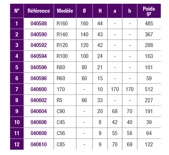 ROND Ø160, ROND Ø 140, ROND Ø 120, ROND Ø 100, ROND Ø 80, ROND Ø 60, PLAQUE RÉFRACTAIRE 170×170, KERR TYPE HIGH Nº 5 · R-5, CARRE C90, CARRE C45 – 5×5, CARRE C56 – 6,5×6,5, CARRE C85 – 8,5×8,5