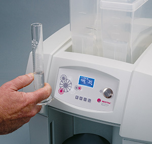 Les résultats parlent d’eux-mêmes: Combiner une balance d’une précision au 1/10 de gramme à la nouvelle pompe, produisent une marge d’erreur inférieure à 2%. Concrètement ces valeurs sont tout à fait compatibles dans le mélange de plâtres de type IV sup. et bien sûr de type III. Cela représente une économie considérable sur les dépenses plâtre d’un laboratoire.