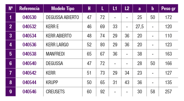 | Producto | 1 – DEGUSSA ABIERTO, 1 – DEGUSSA ABIERTO (10 U.), 2 – KERR E, 2 – KERR E (10 U.), 3 – KERR ABIERTO, 3 – KERR ABIERTO (10 U.), 4 – KERR LARGO, 4 – KERR LARGO (10 U.), 5 – MANFREDI, 5 – MANFREDI (10 U.), 6 – DEGUSSA, 6 – DEGUSSA (10 U.), 7 – KERR, 7 – KERR (10 U.), 8 – KRUPP, 8 – KRUPP (10 U.), 9 – CREUSETS, 9 – CREUSETS (10 U.) |