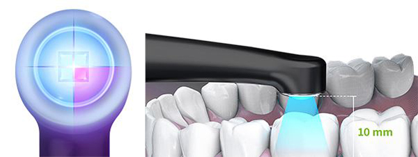 Se suministra con dos cabezales: uno de ellos es un detector de caries. El tono de la luz emitida por este segundo cabezal produce sombras en las piezas dentales con caries, lo que permite una sencilla y precoz detección. |