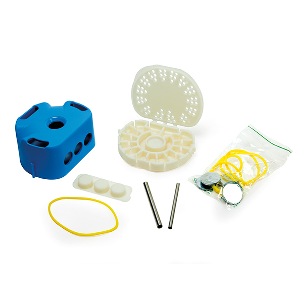 La mufla de vertido para resinas se suministra con imán, arandelas para imán, gomas para el cierre y dos tubos en acero inoxidable para el corte de los bebederos.